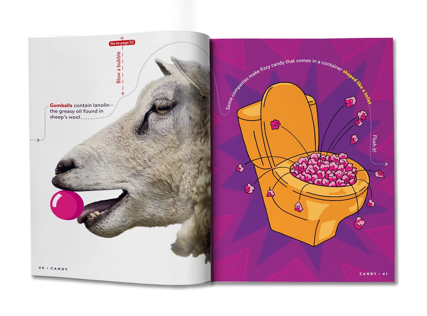 Open book showing a sheep and an illustration of candy in a toilet bowl on a purple background.