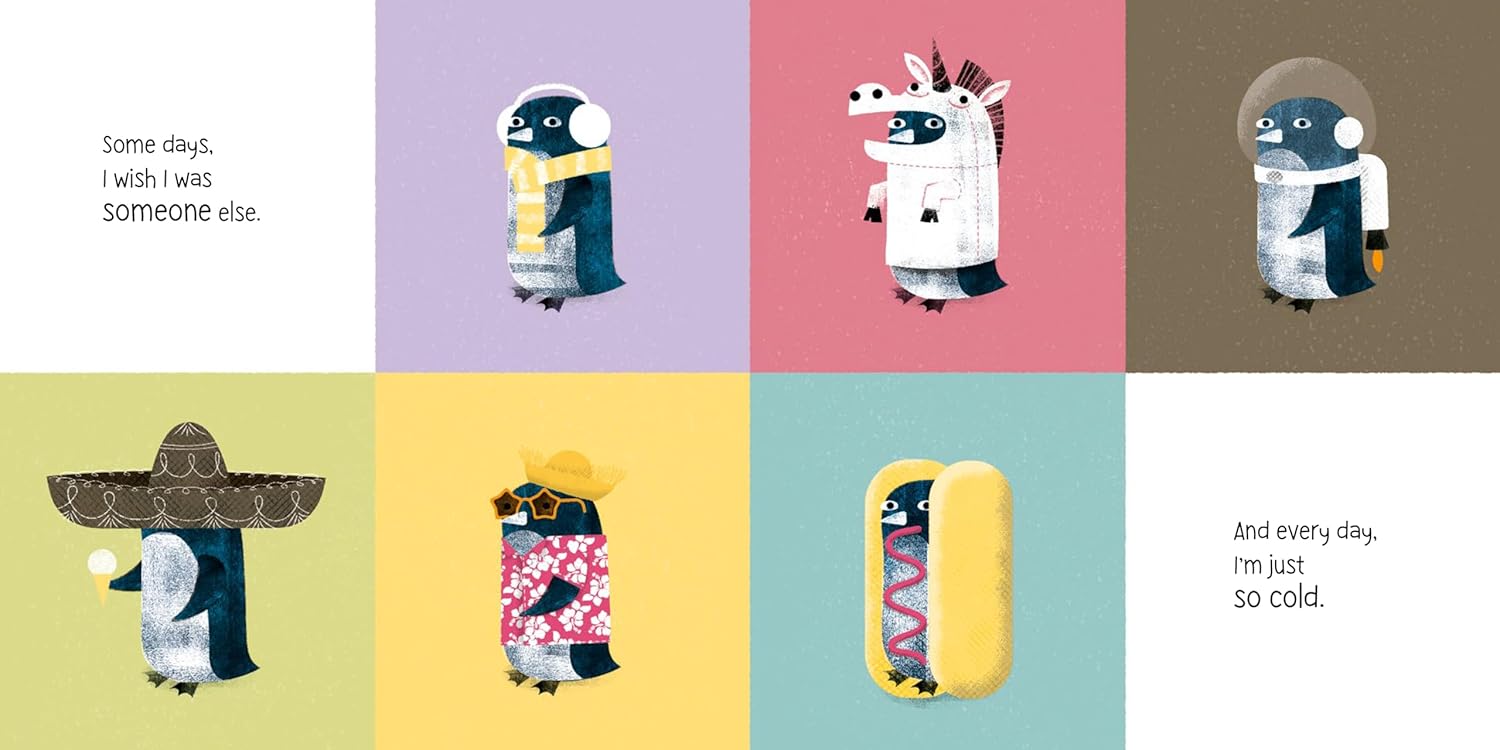 Illustrations of penguins in various outfits on a colorful background with text.